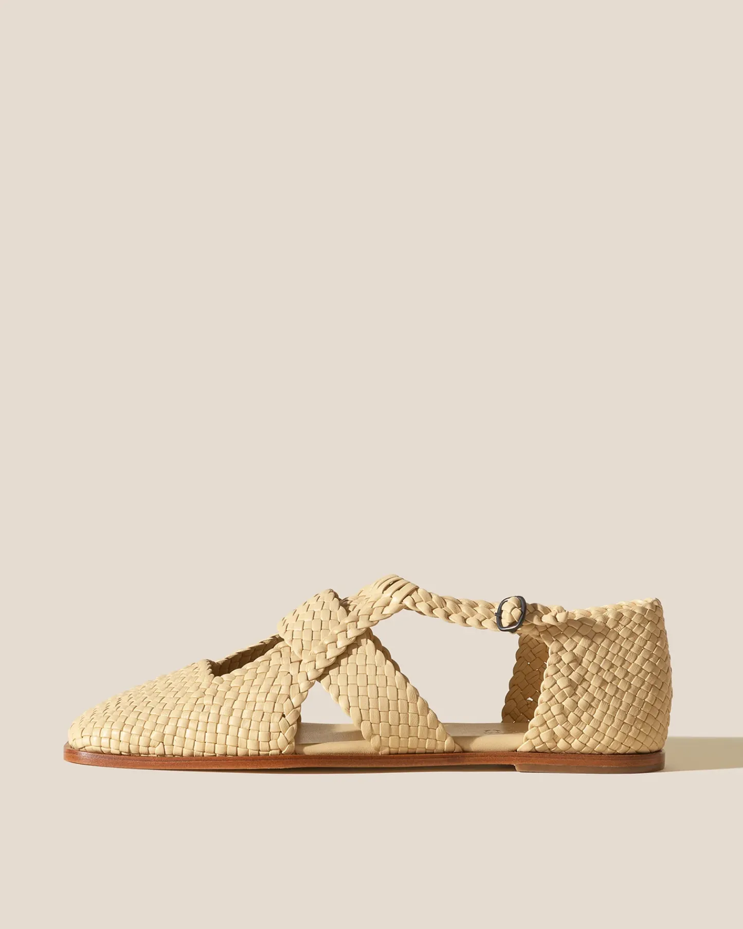 Woven T-bar sandal crafted in supple lambskin.