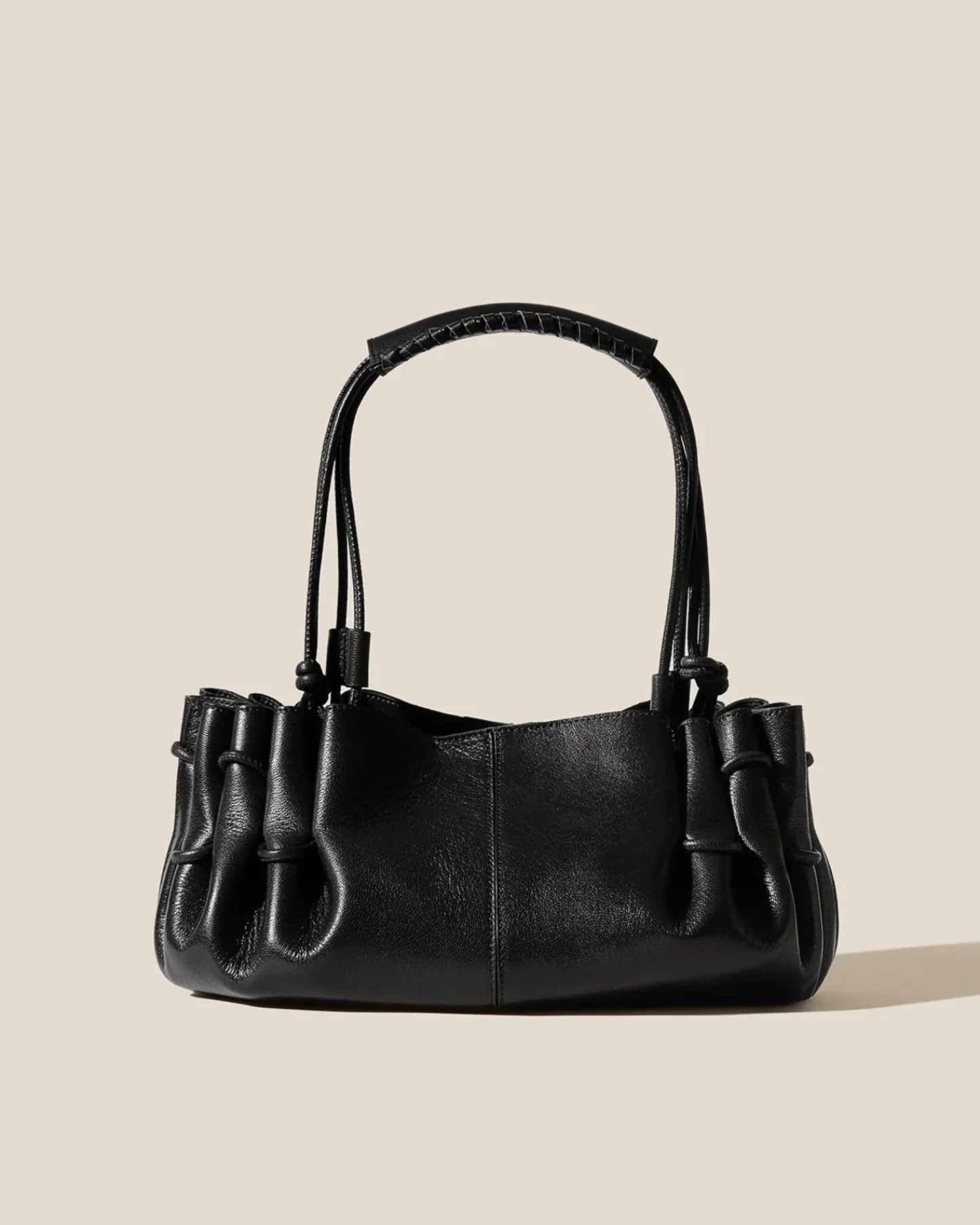 Pleated hand/shoulder bag crafted in supple shiny lambskin.