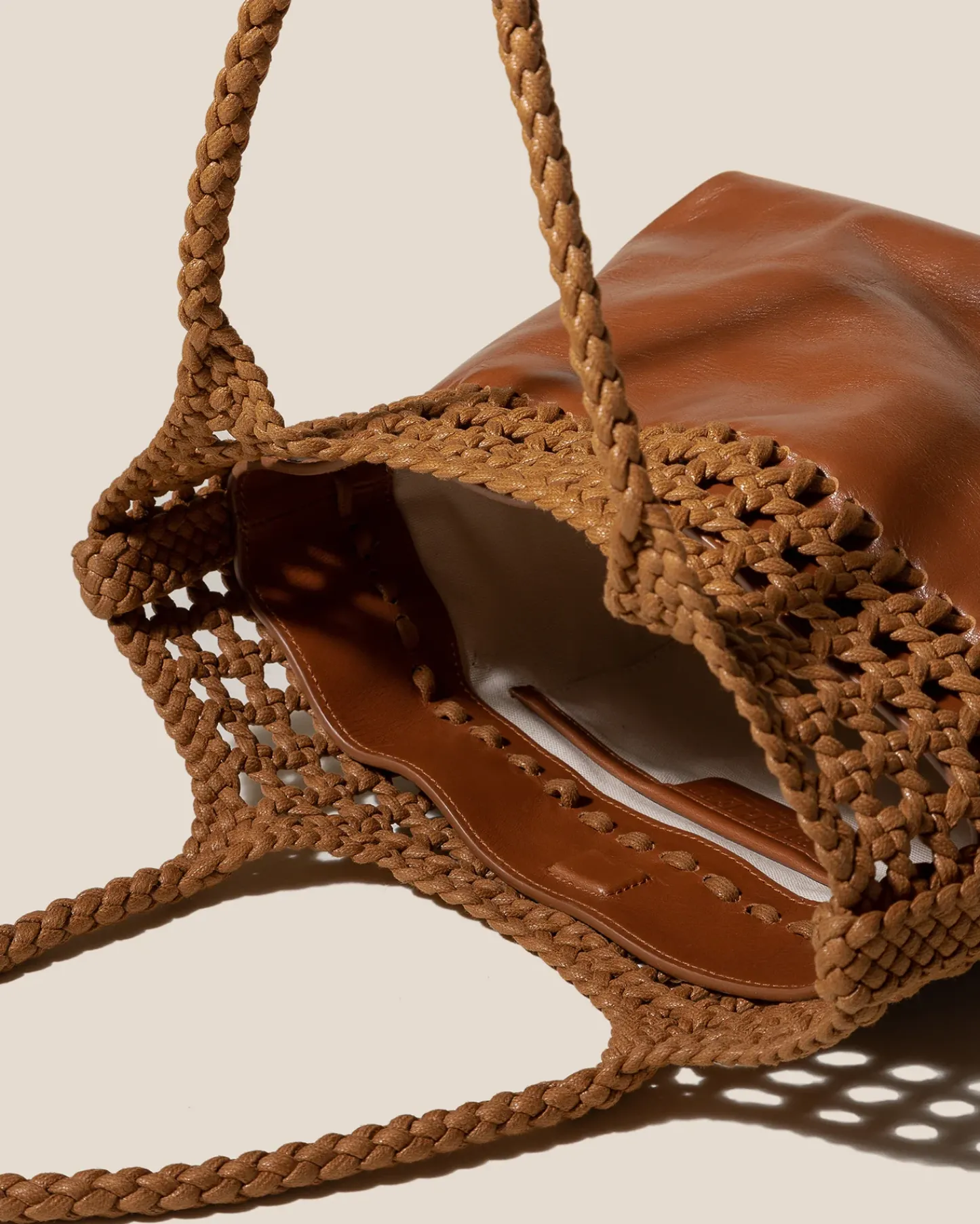 Braided top shoulder bag crafted in polished calf leather and waxed cotton. Organic cotton lining.