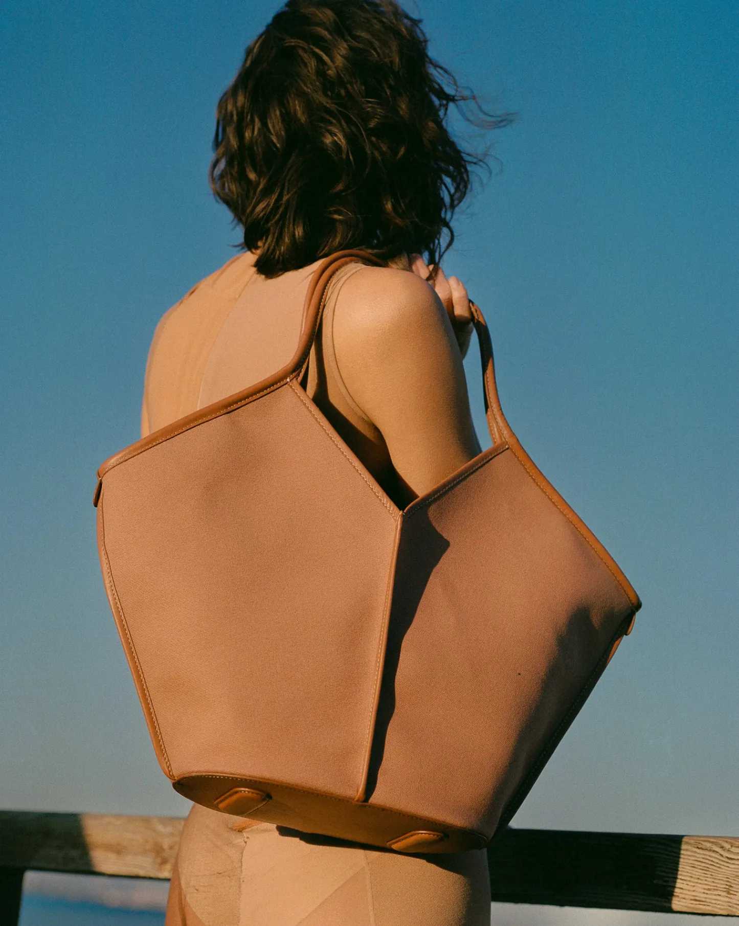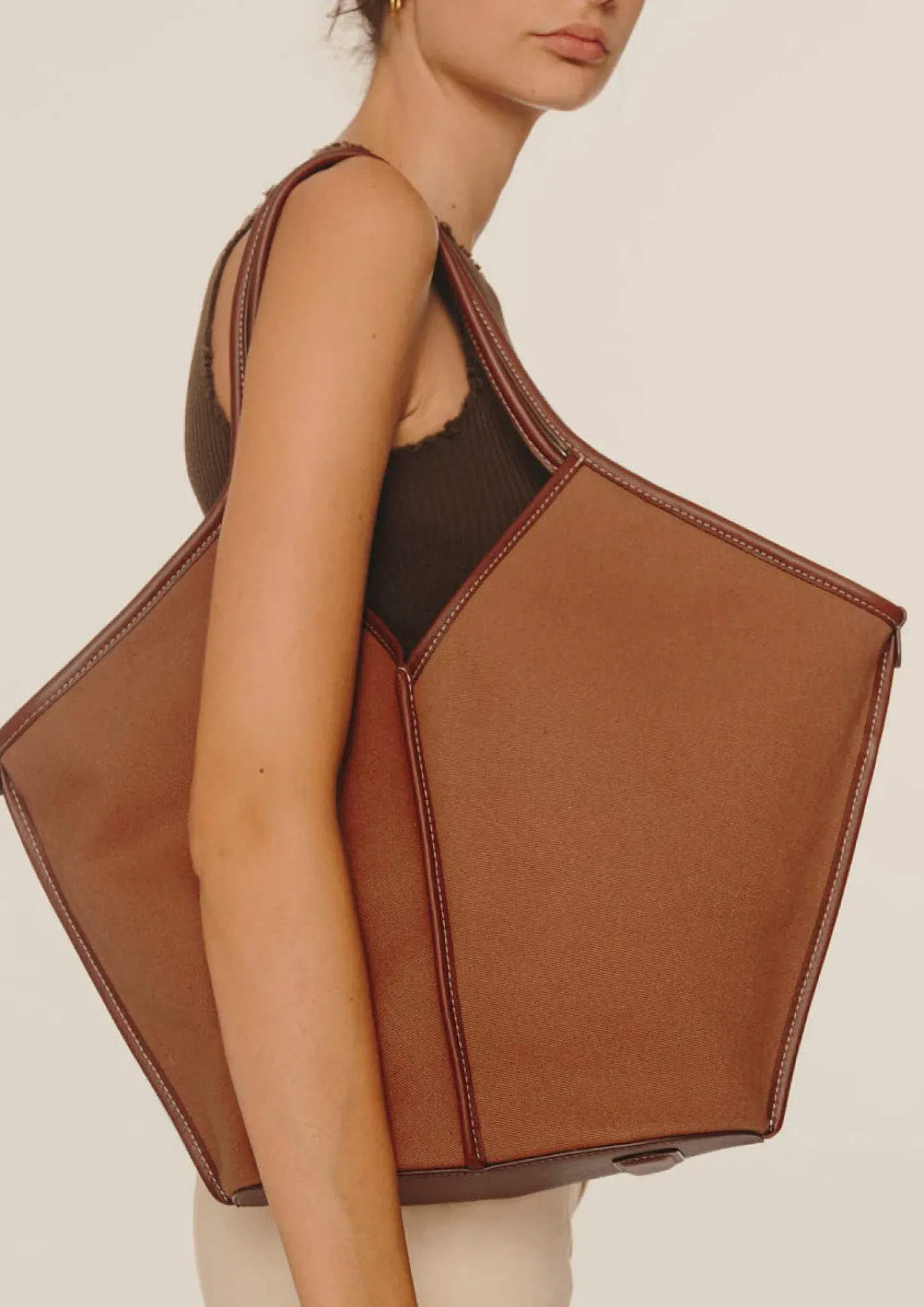 Organic cotton tote bag edged with smooth leather. It has a zipped pouch to secure small essentials and slim top handles that sit over the shoulder.