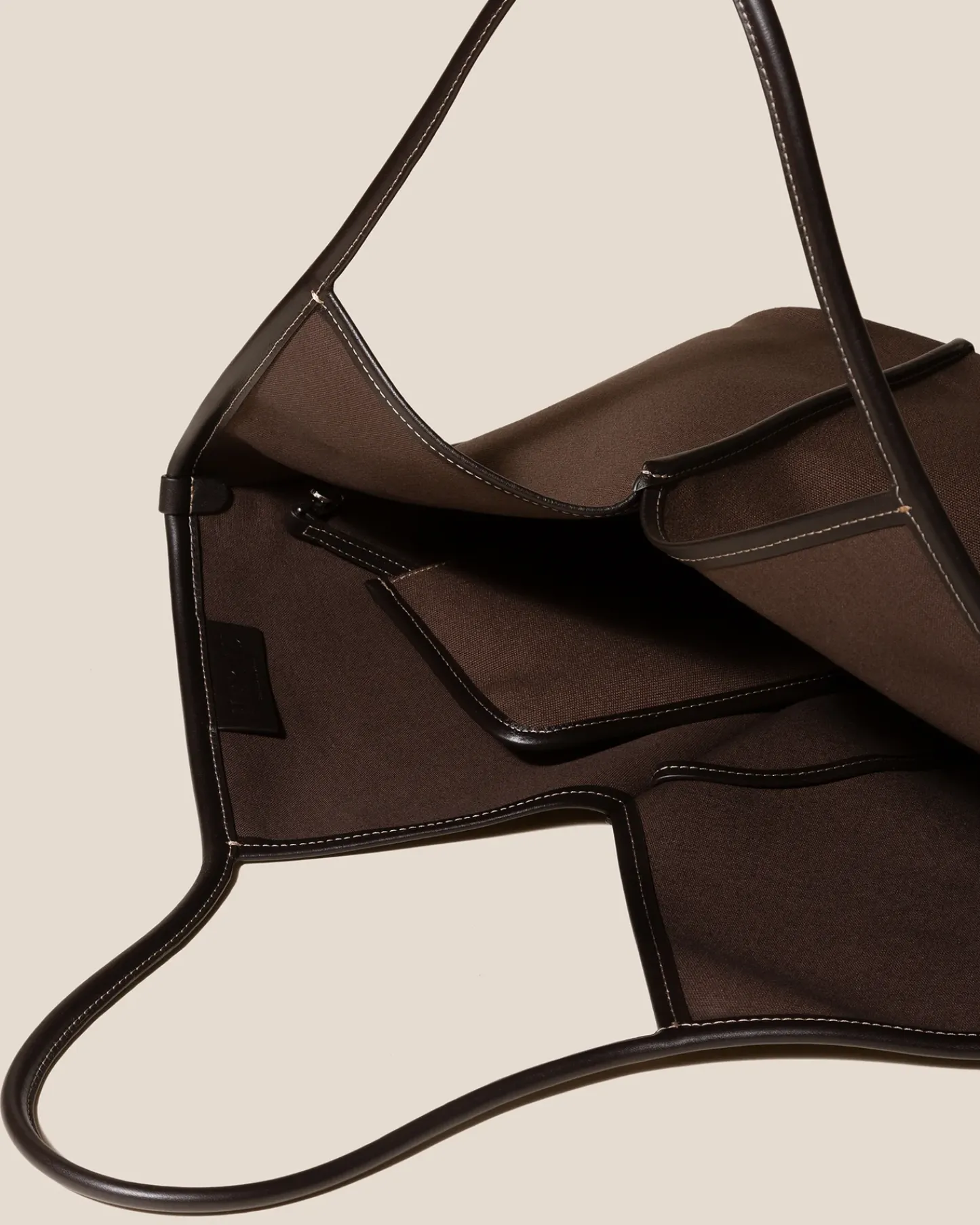 Organic cotton tote bag edged with smooth leather. It has a zipped pouch to secure small essentials and slim top handles that sit over the shoulder.