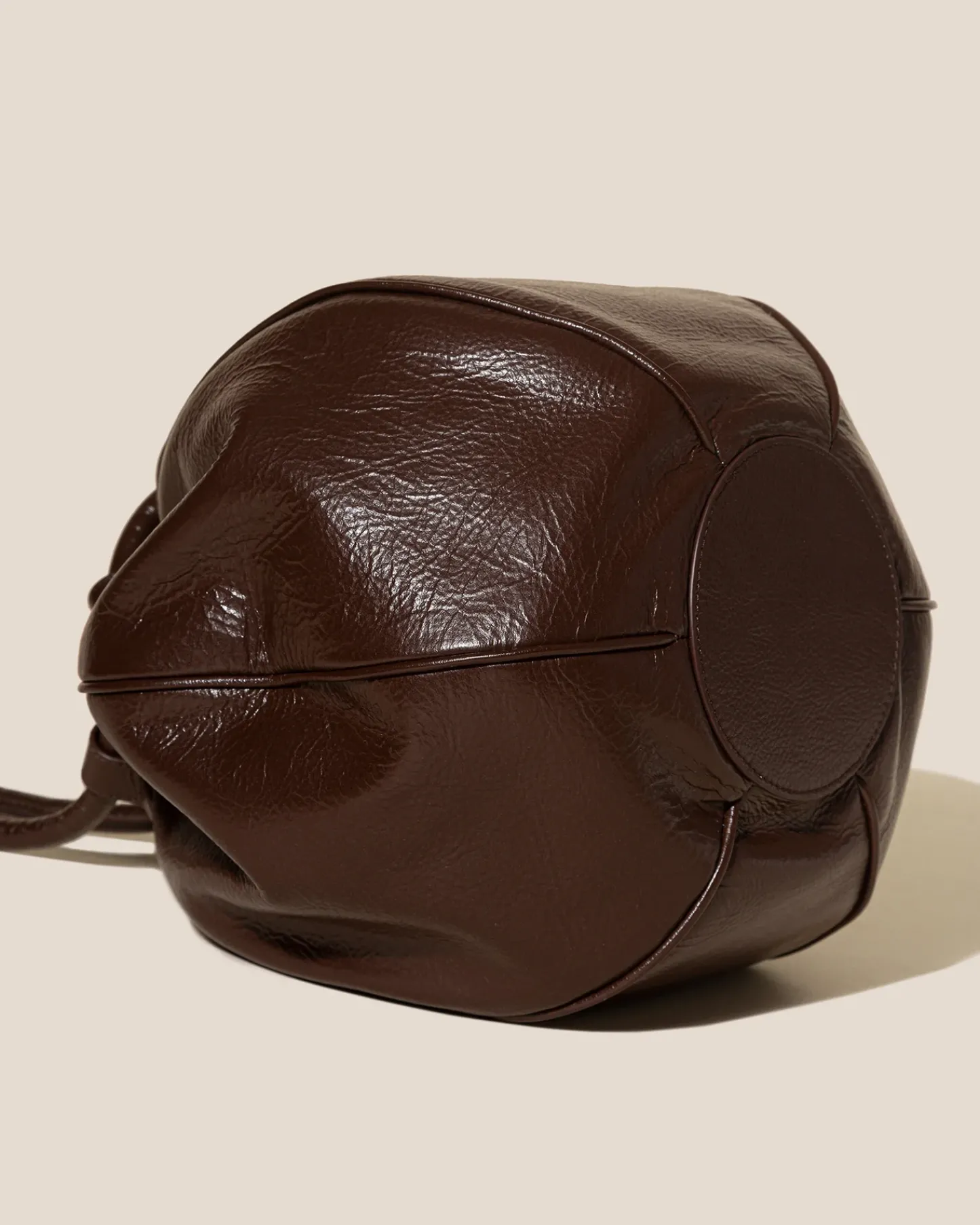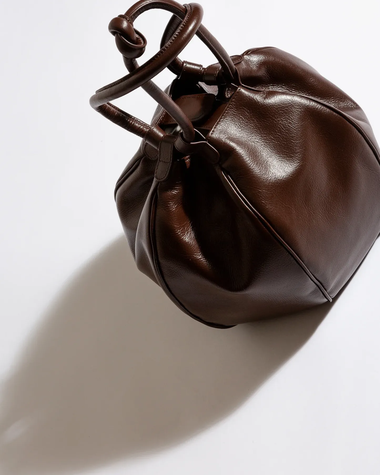 Balloon-shaped drawstring shoulder/tote bag crafted in distressed calf leather and lined with organic cotton canvas.