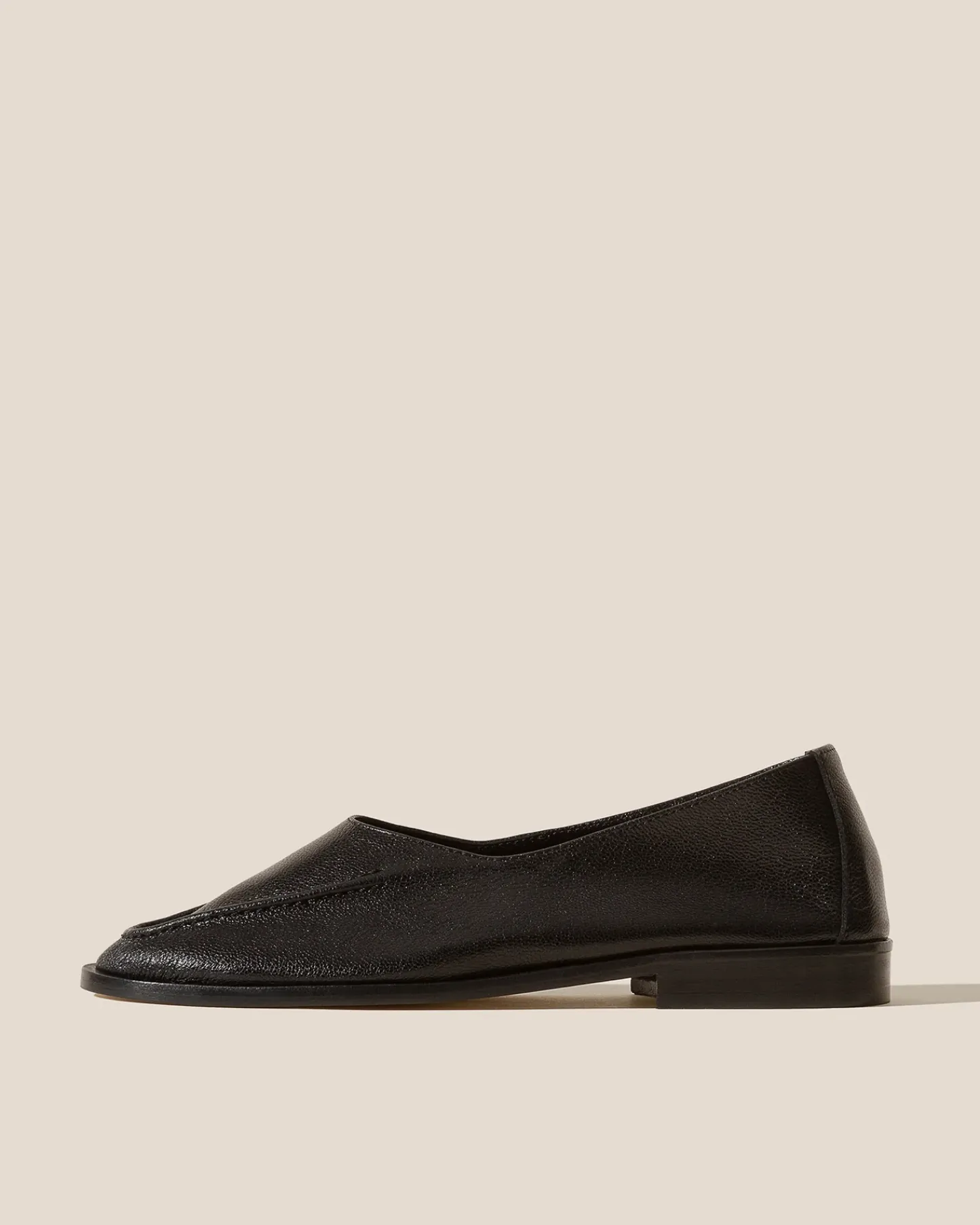 High cut deconstructed loafer with thick sole, crafted in supple shiny lambskin.