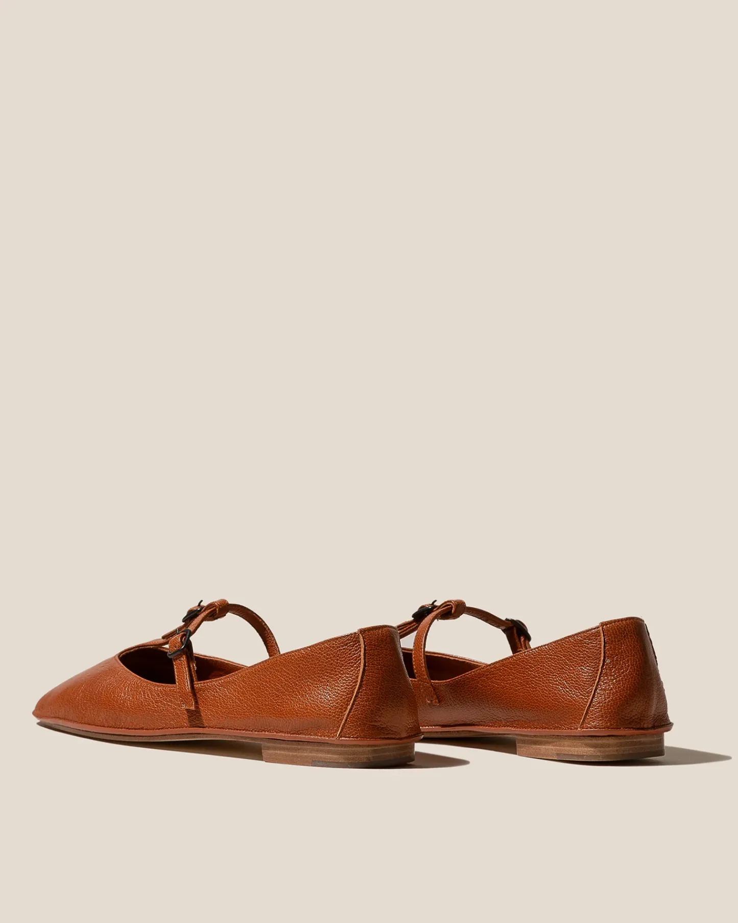 Soft T-bar with buckle detail, crafted in supple shiny lambskin.