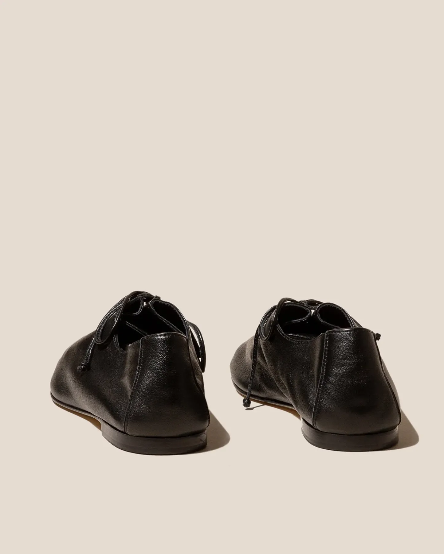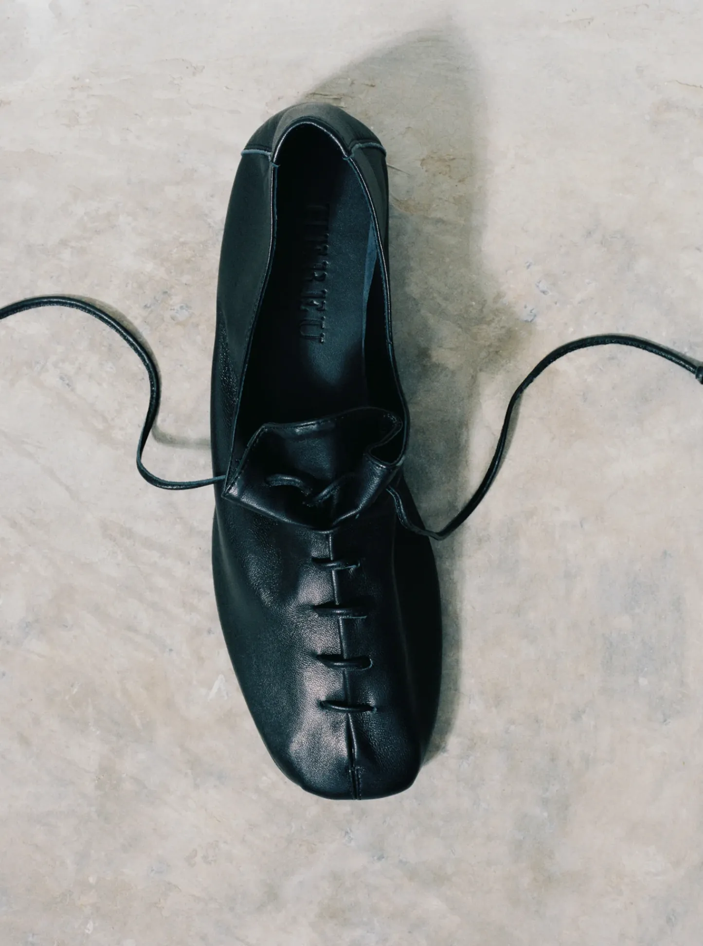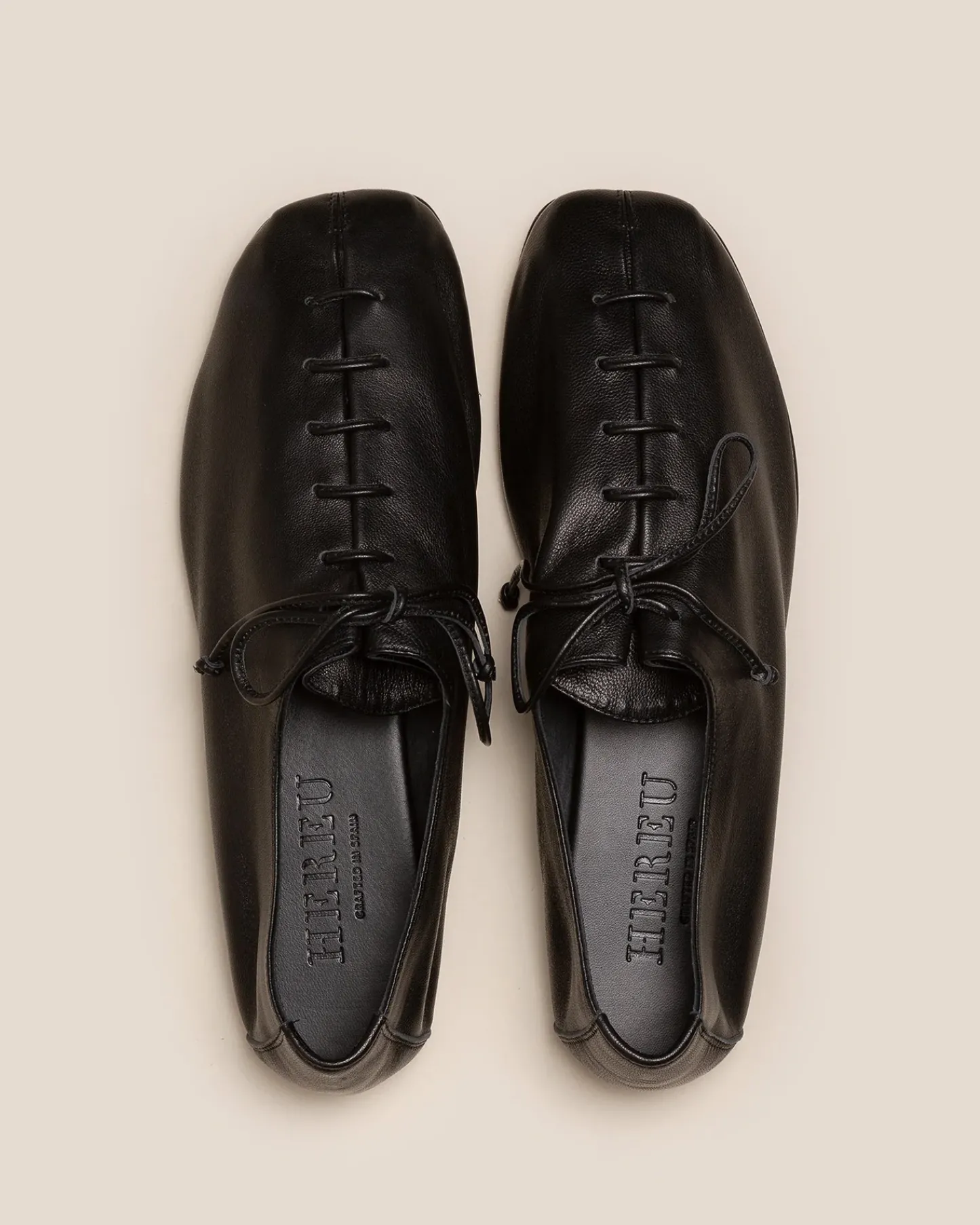 Round-toe flat lace-up shoe with bellows tongue (one piece). Crafted in soft calf leather with matching leather laces.