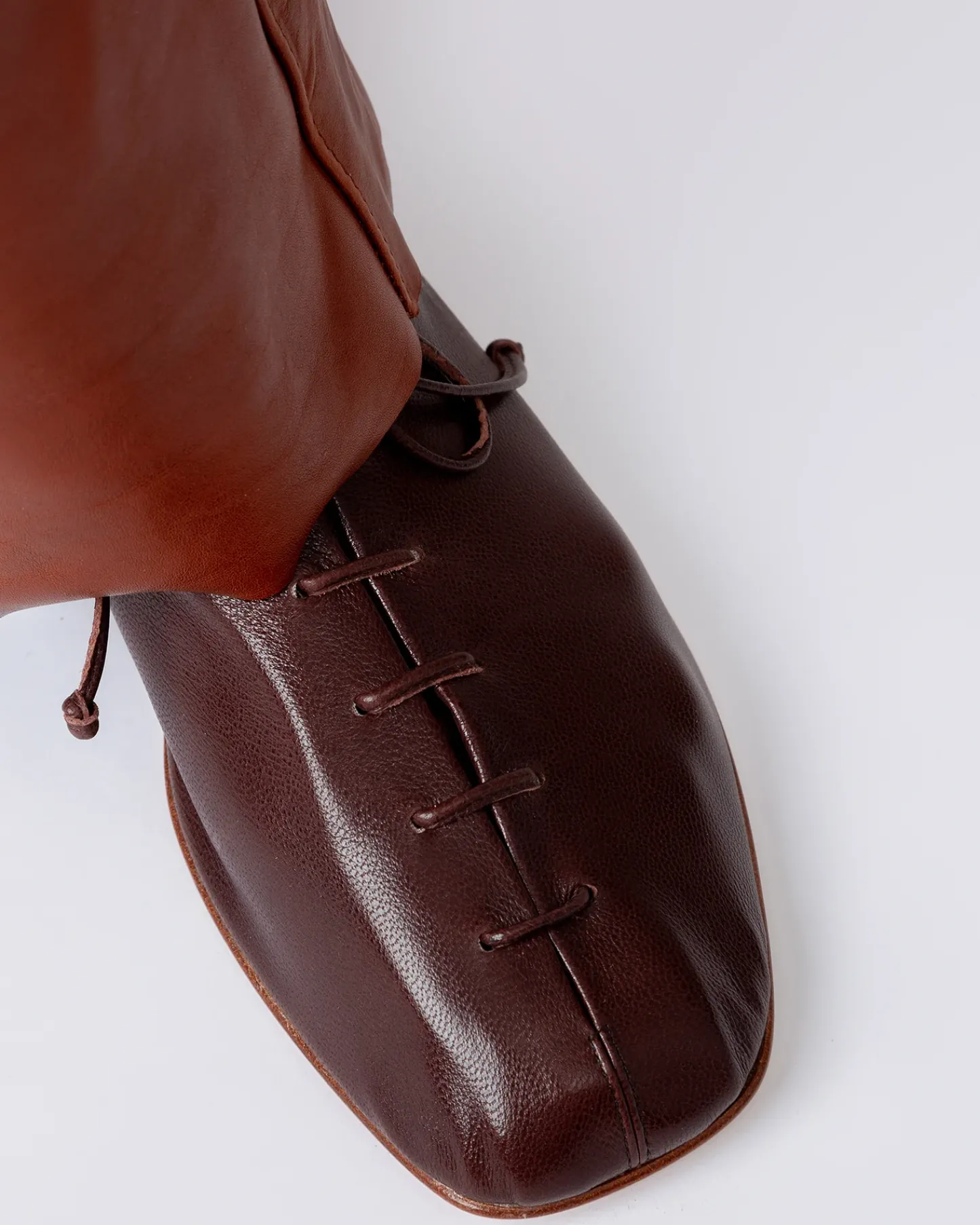Round-toe flat lace-up shoe with bellows tongue (one piece), crafted in unlined supple shiny lambskin with matching leather laces.