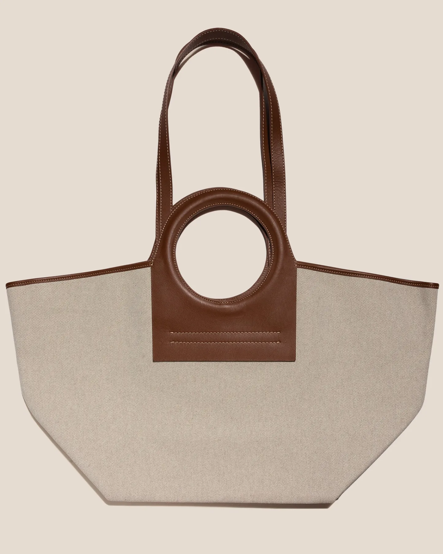 Tote bag constructed from premium ecru canvas with leather handles and trims, lined with natural cotton canvas.