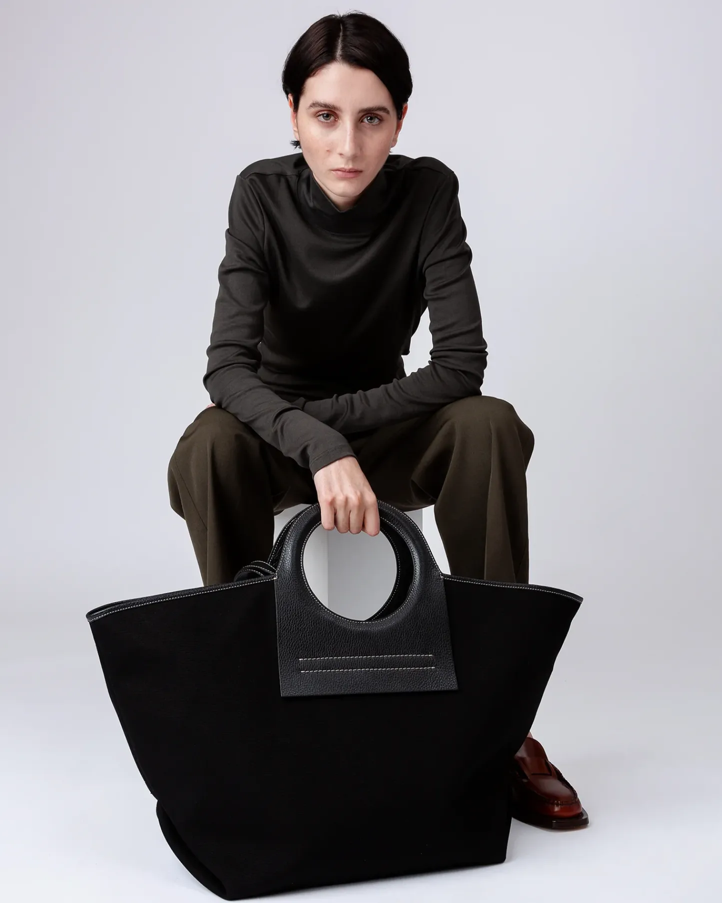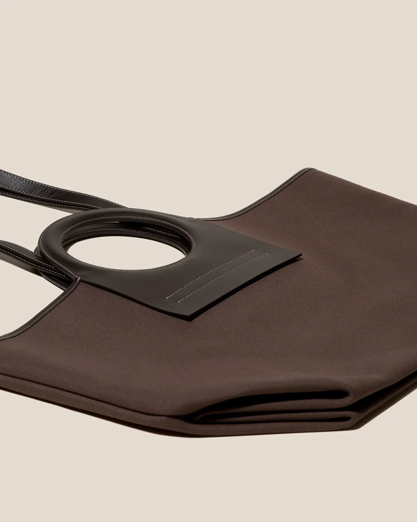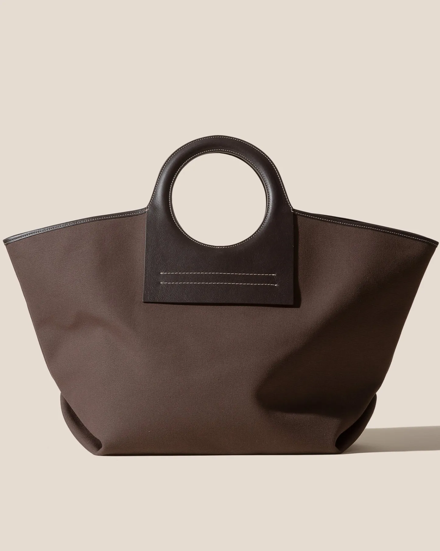 Tote bag constructed from premium ecru canvas with leather handles and trims, lined with natural cotton canvas.