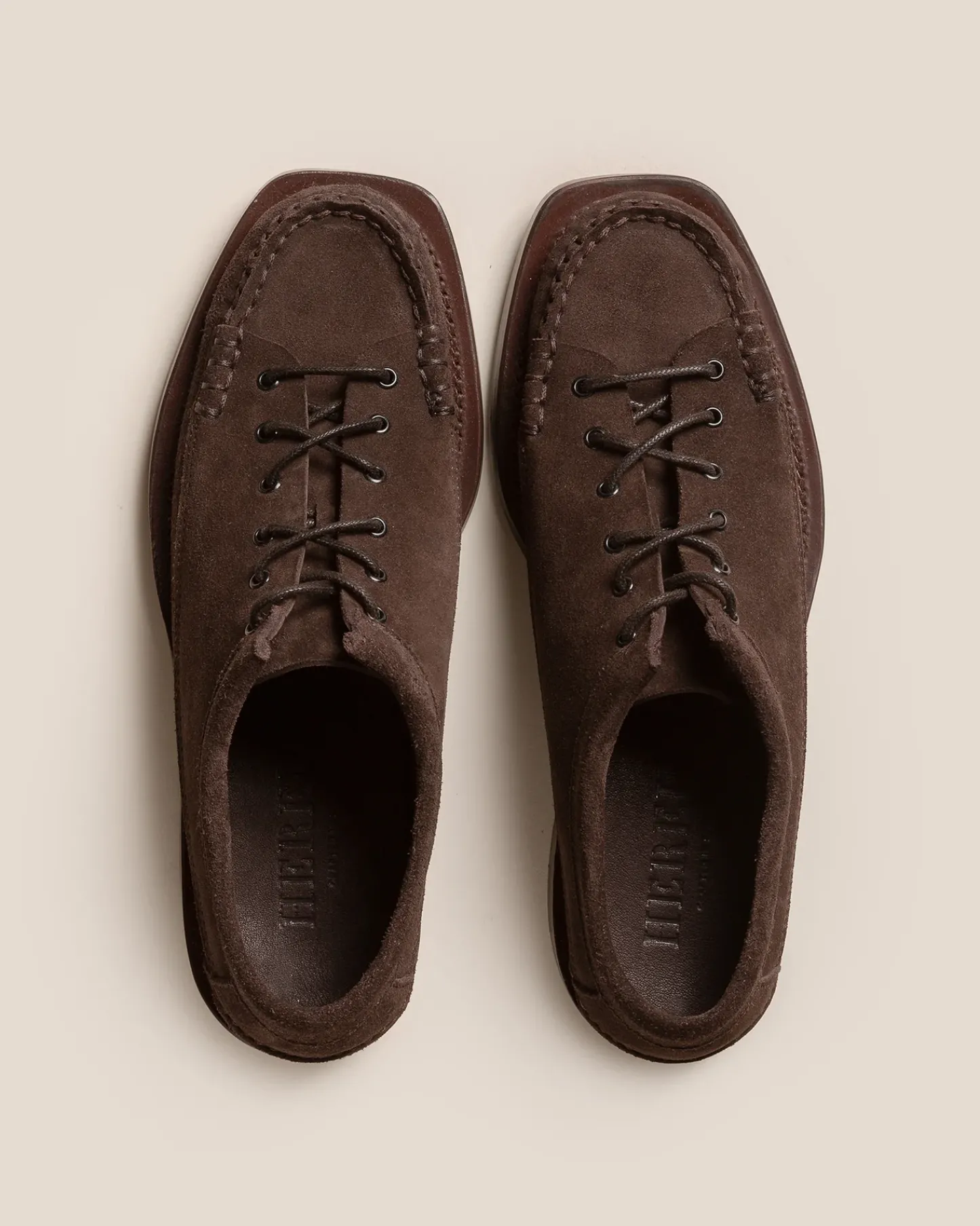Lace-to-toe loafer crafted in double sided calf suede. The upper has been hand sewn using the traditional moccasin construction. The outsole is stitched to the upper for extra flexibility and durability.