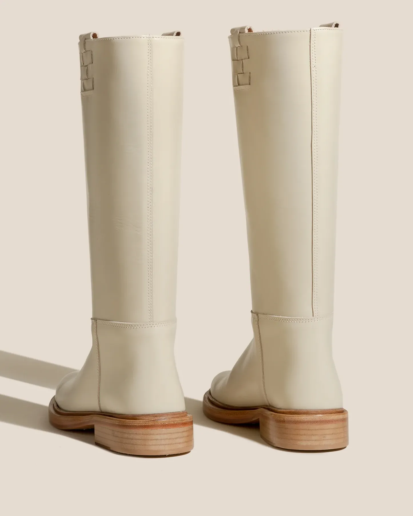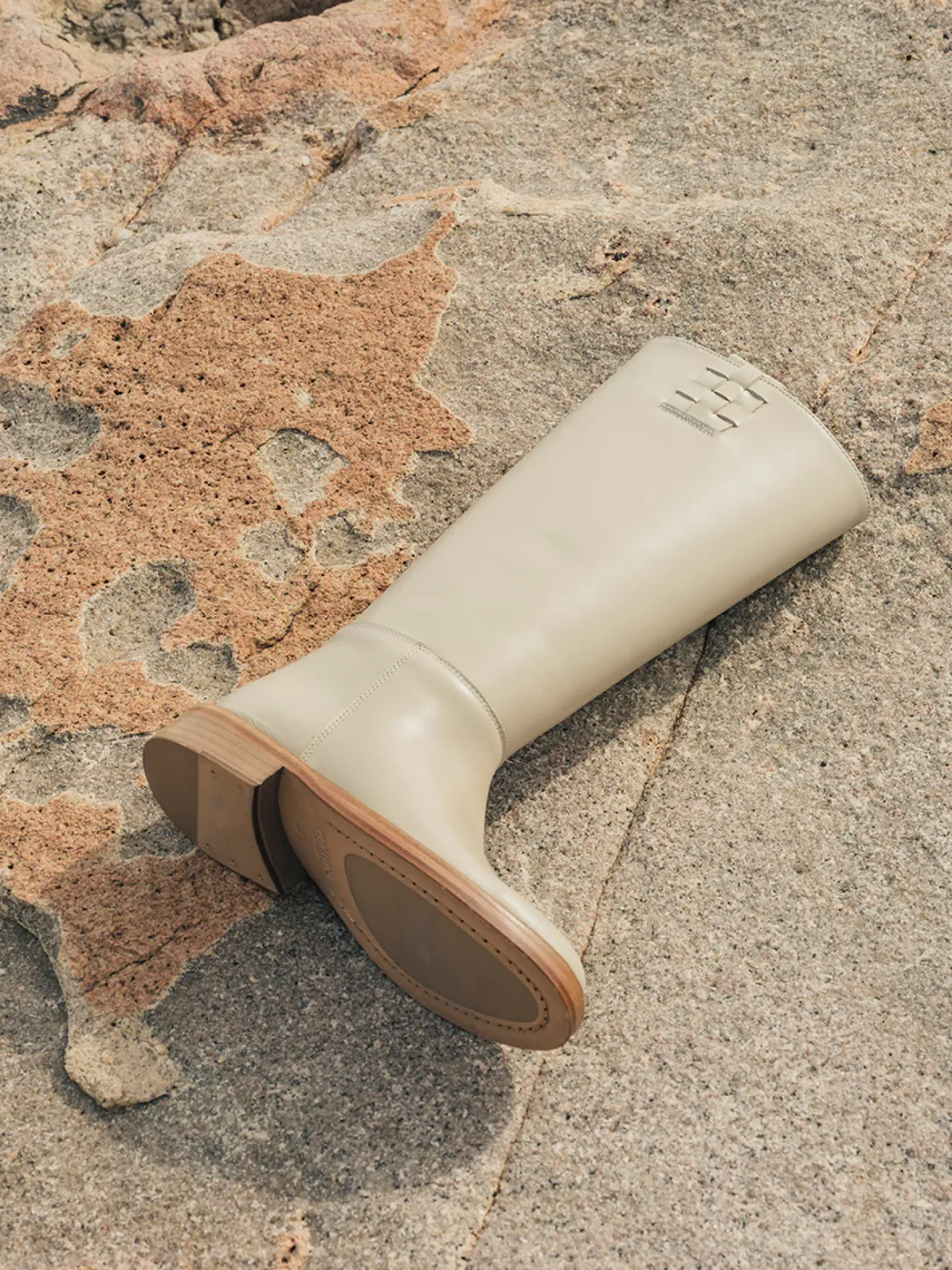 Under the knee pull-on boot with side interwoven detail. Crafted in Spanish calf leather and lined with calf leather lining.