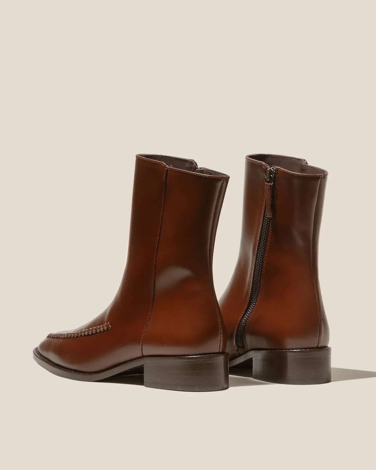 Almond toe mid calf boot with braided details, crafted polished structured calf leather.