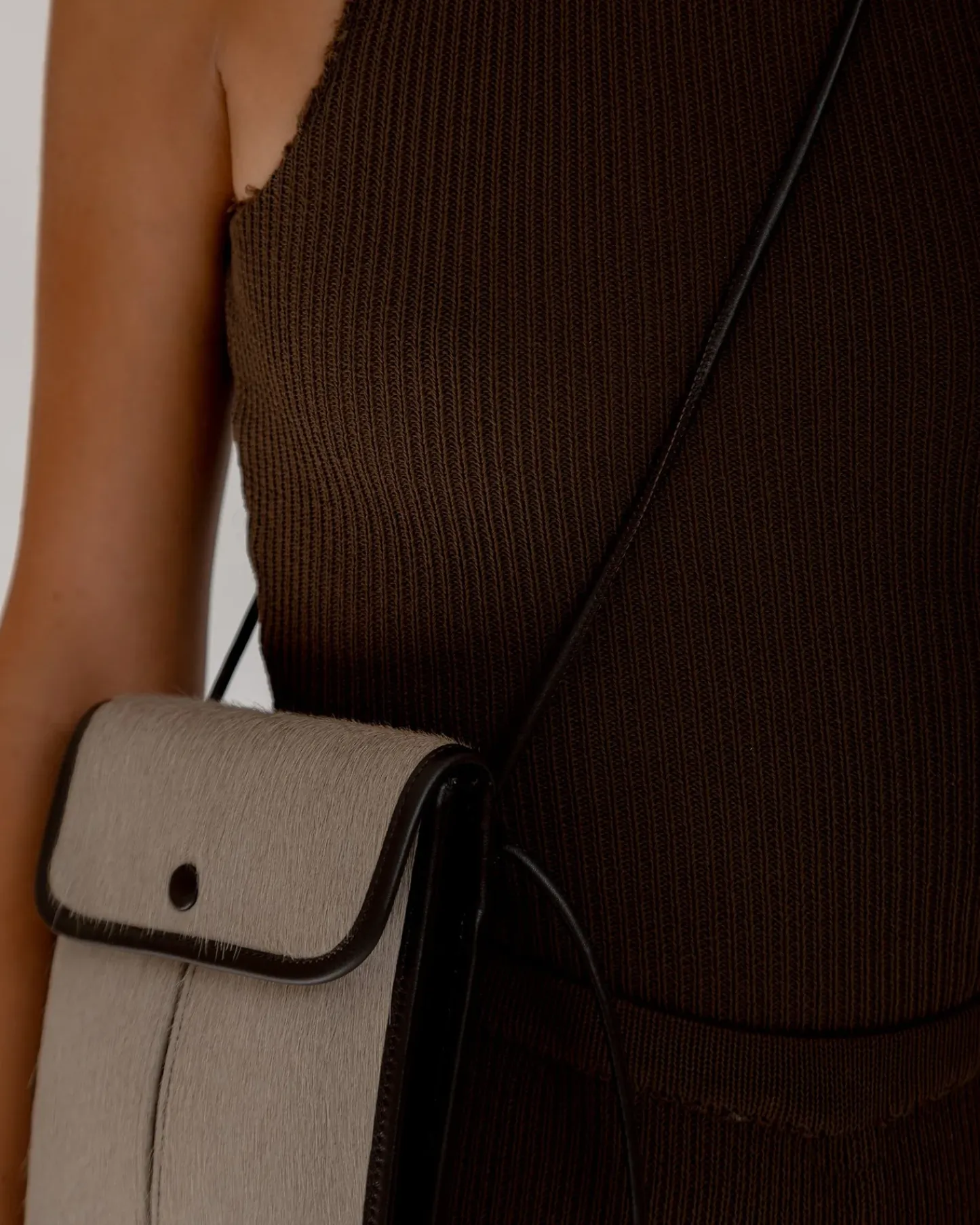Square flat crossbody crafted in European calf hair and trimmed with calf leather. Organic cotton lining.