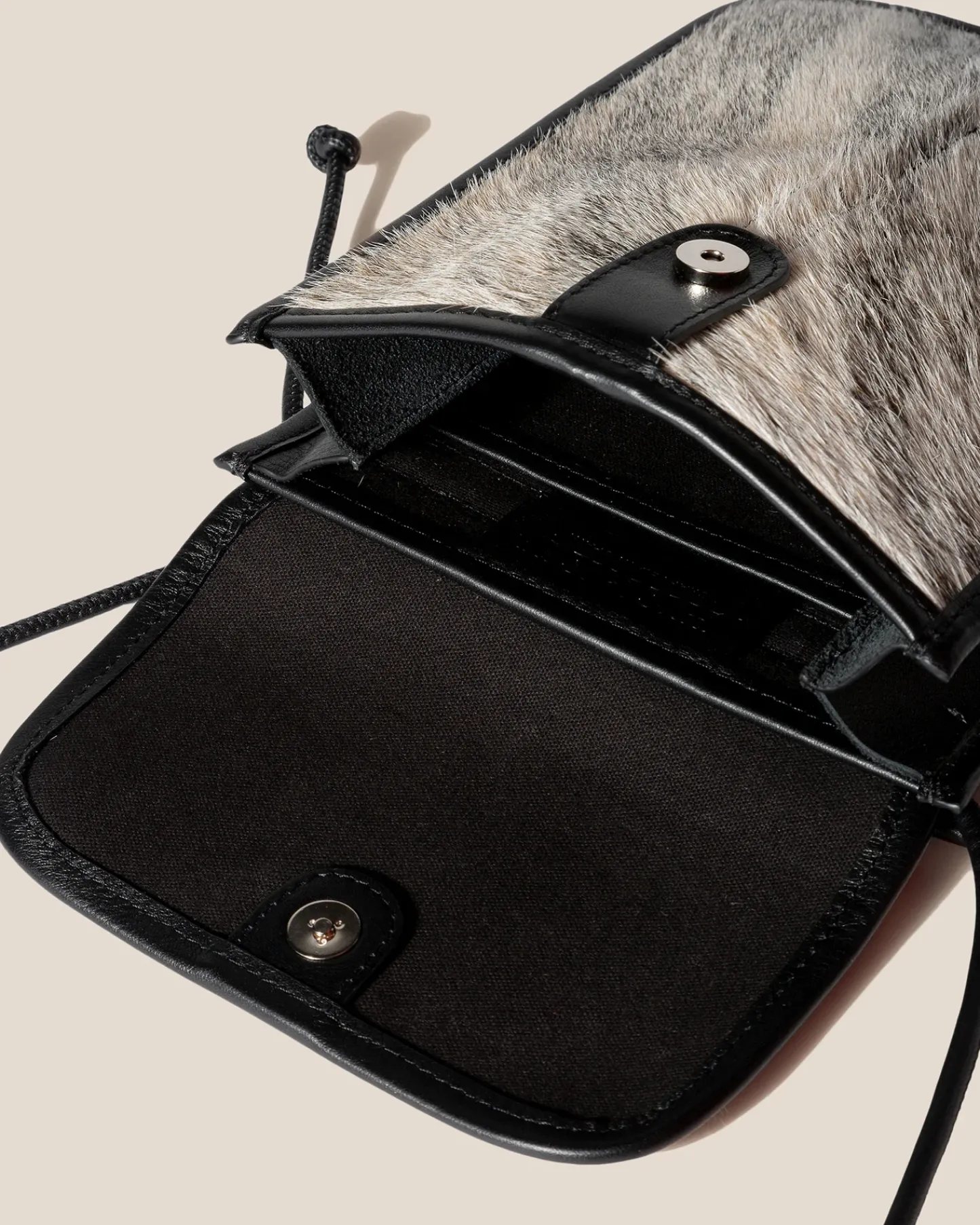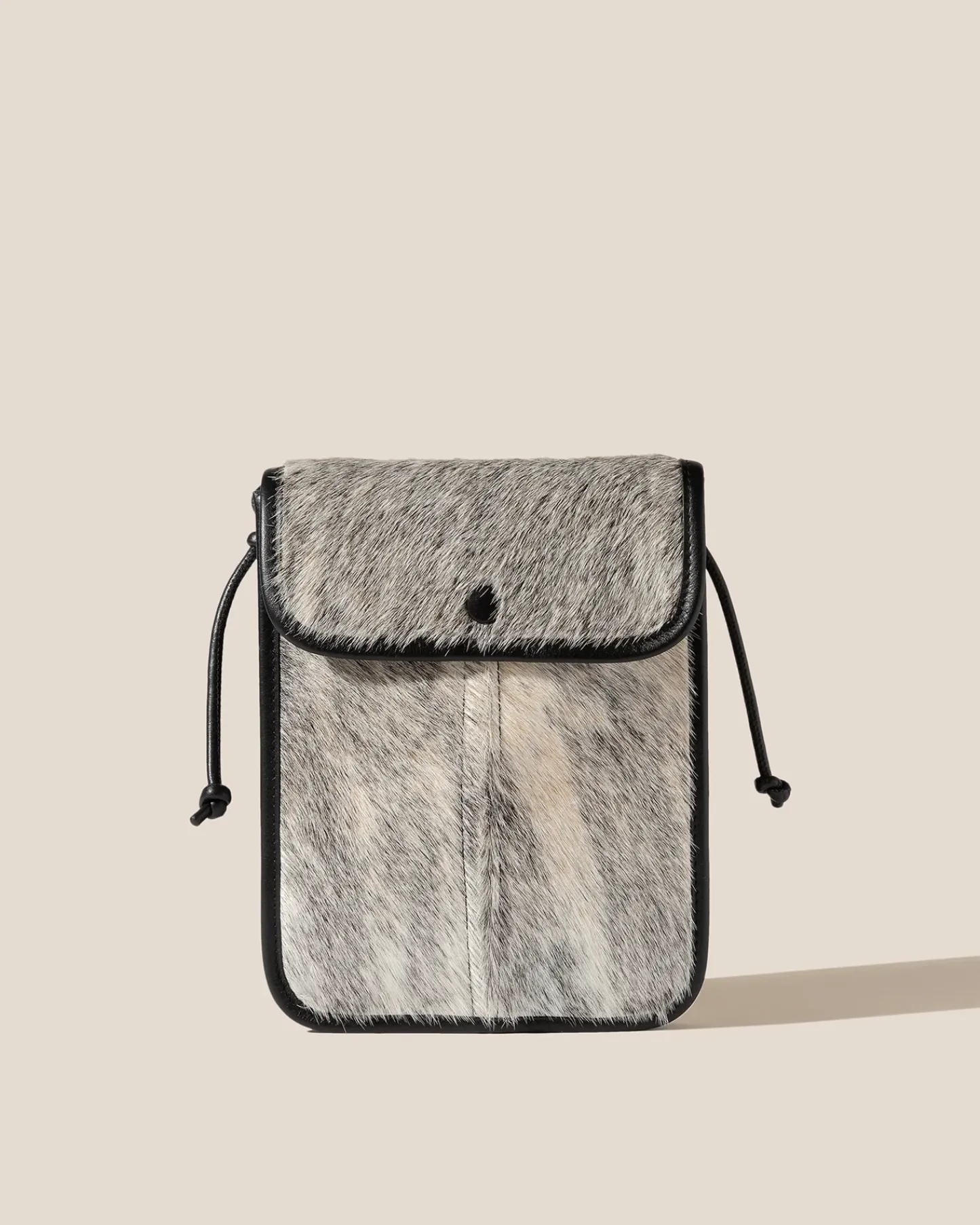 Square flat crossbody crafted in European calf hair and trimmed with calf leather. Organic cotton lining.