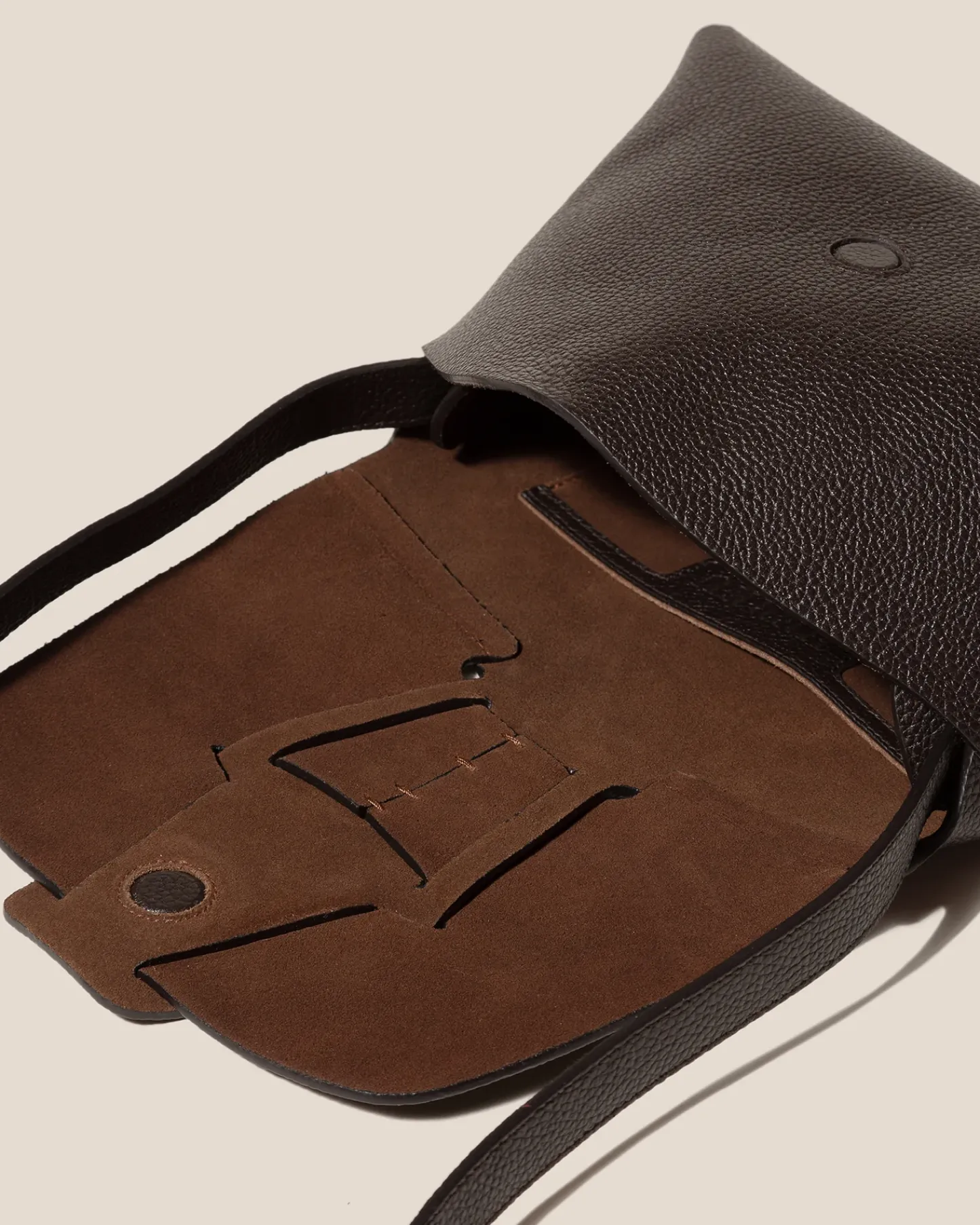Crossbody bag with woven detail crafted in grainy structured calf leather and lined in calf suede.