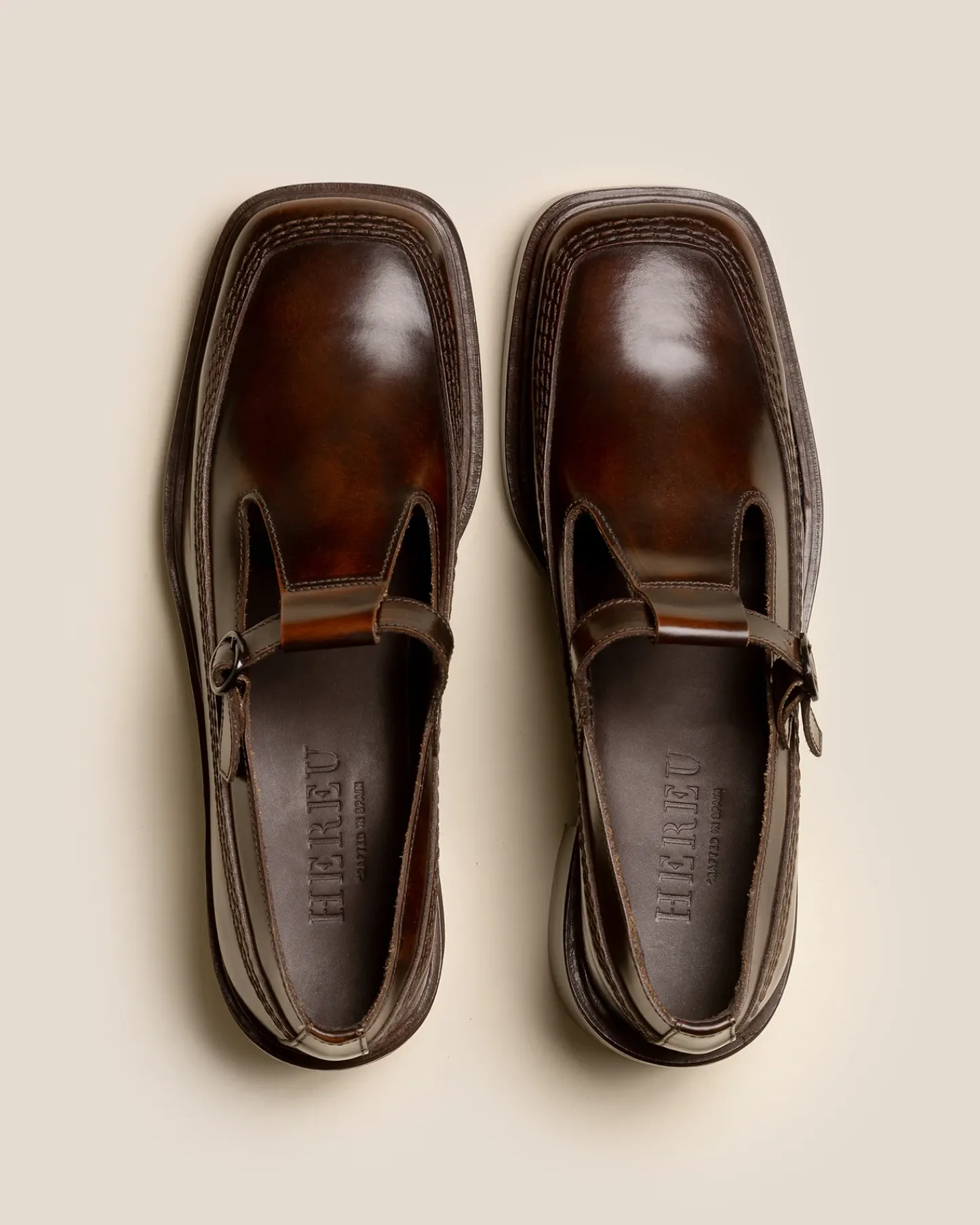 T-Bar heeled loafer crafted in Spanish brushed leather.