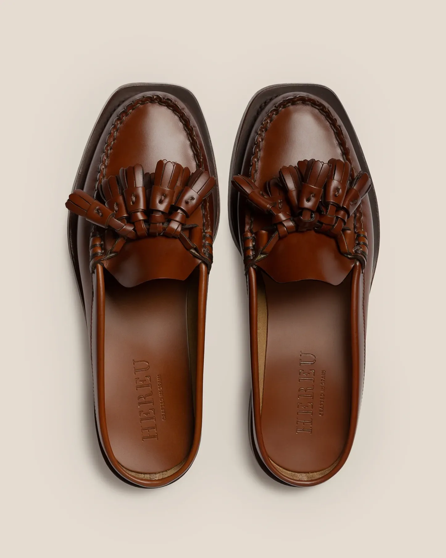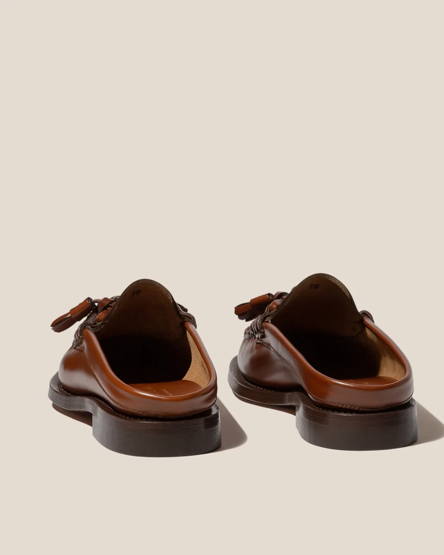 Tasseled mule loafer crafted in Spanish full grain leather. The upper has been hand sewn using the traditional moccasin construction. The outsole is stitched to the upper for extra flexibility and durability.