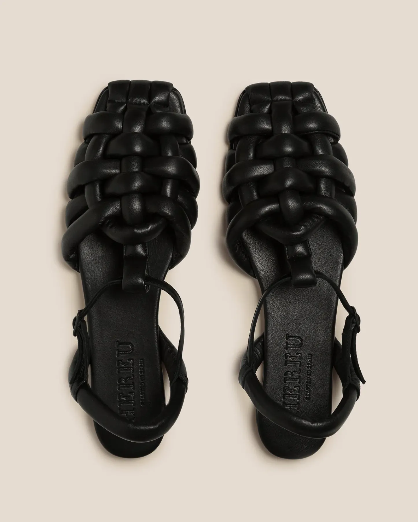 Square toe padded flat fisherman sandal crafted in soft lambskin.