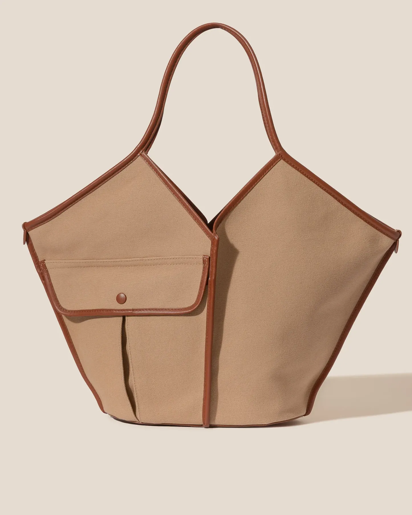 Side-pocket organic cotton tote bag edged with smooth leather. It has a zipped pouch to secure small essentials and slim top handles that sit over the shoulder.