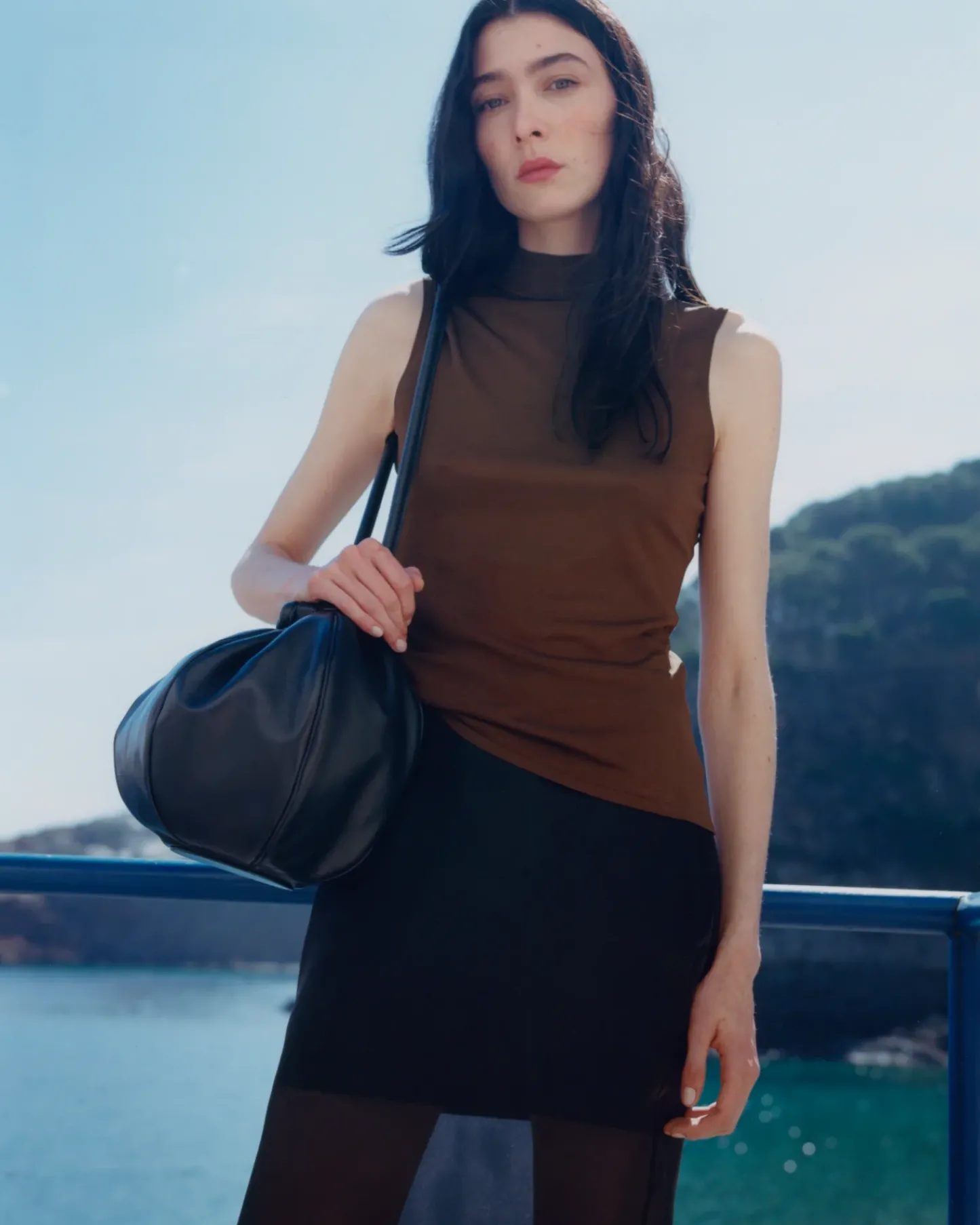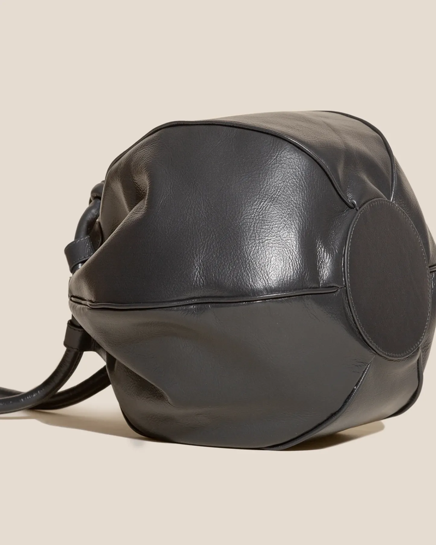 Balloon-shaped drawstring shoulder/tote bag crafted in distressed calf leather and lined with organic cotton canvas.