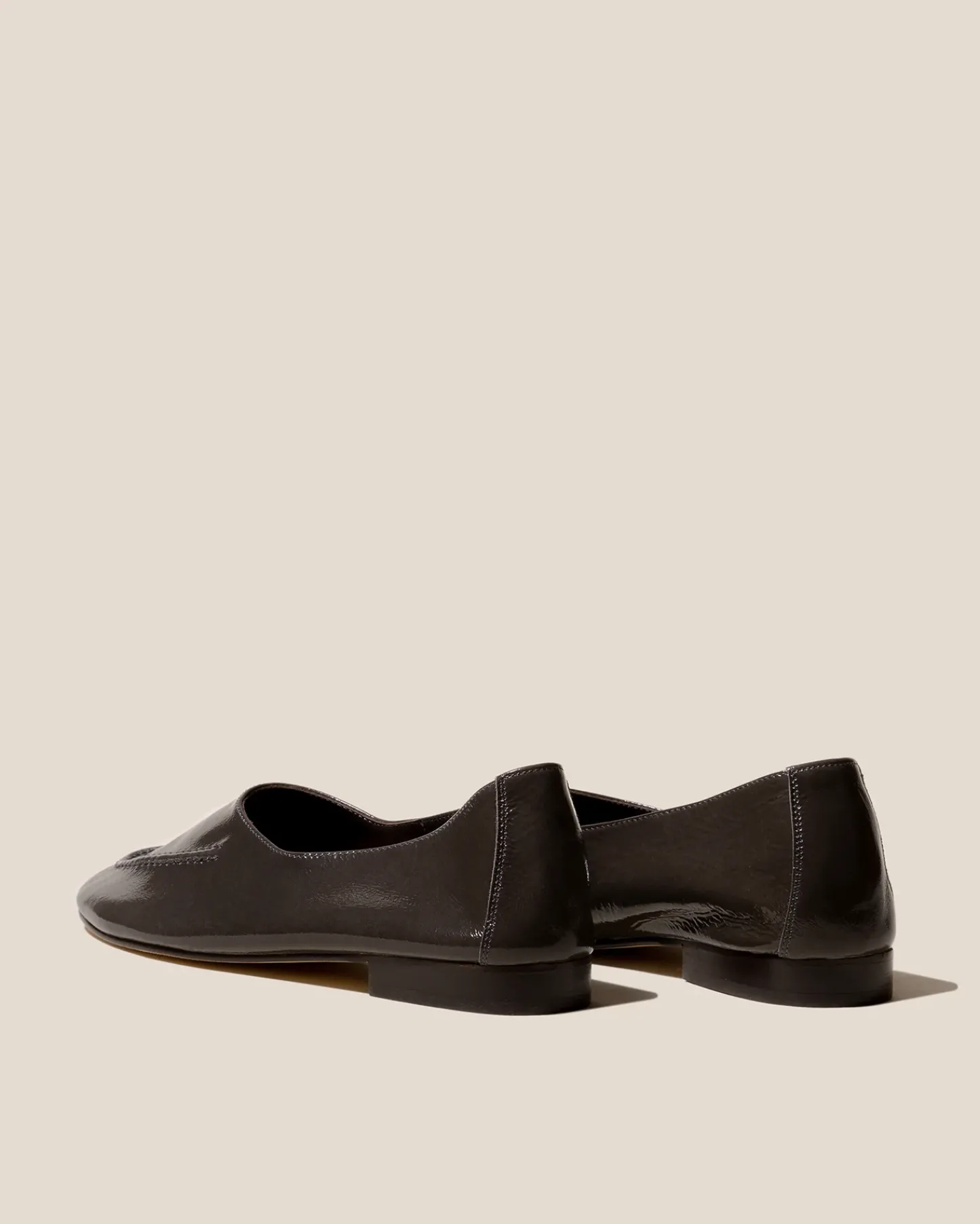 High cut deconstructed loafer crafted in crinkled glossy lambskin.