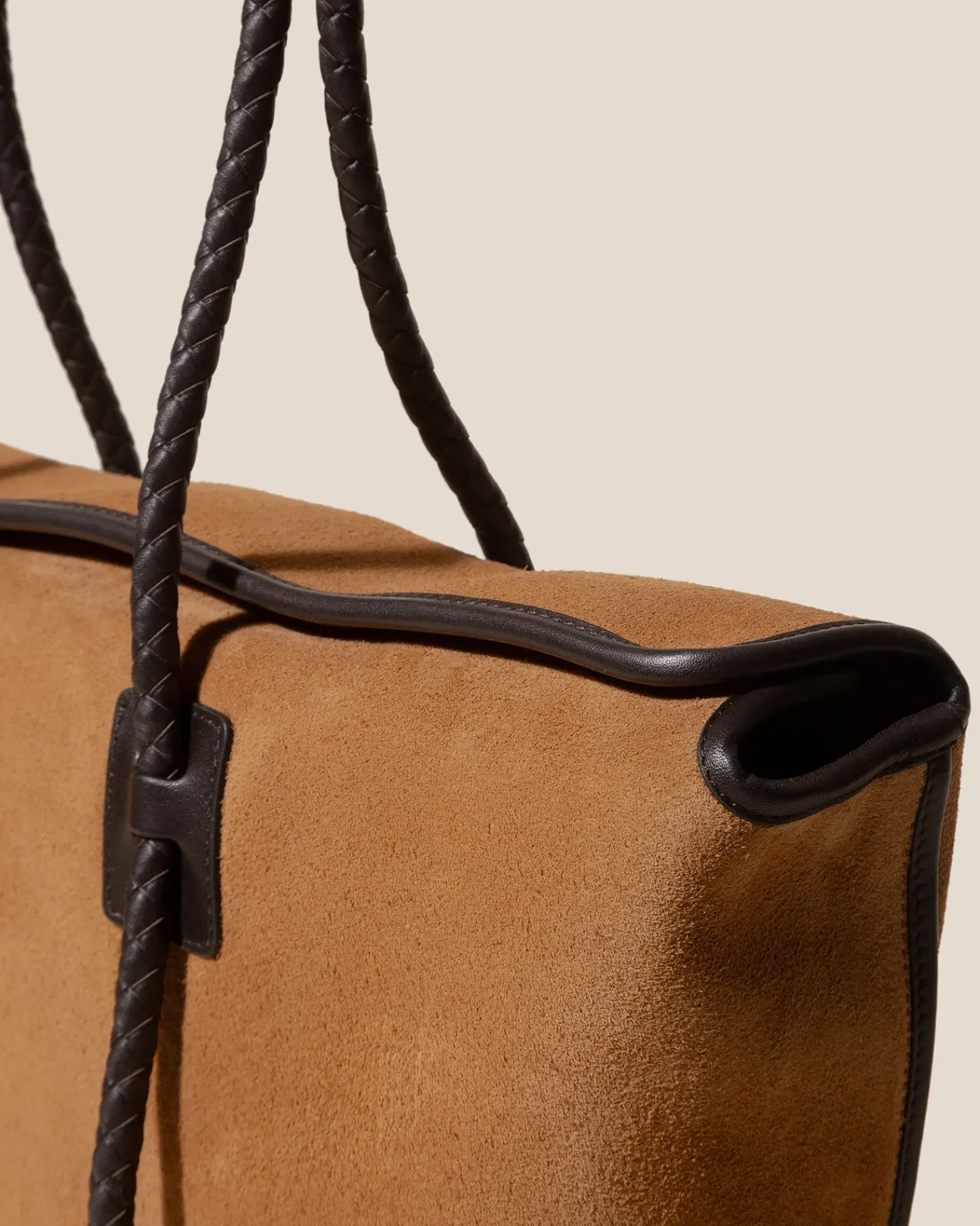 Leather framed tote crafted in calf suede and smooth soft calf leather.